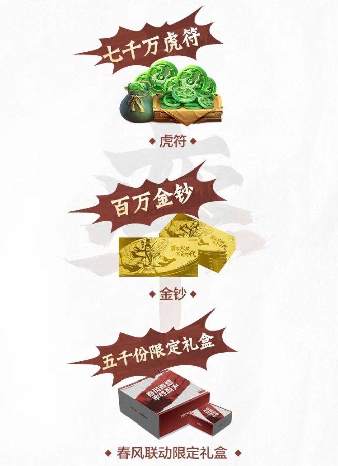 “率土开荒节”的一亿虎符的大放送,远不止直播中展现的一点。玩家们想要获得奖励的条件也很简单:攻城达到一定名次;占领地块还有机会触发隐藏奖励;冲榜杀进前50名的玩家们还能领取精美的春风联动限定礼盒一份。而且,在赛季结算时获得征服的国家或同盟里累计武勋值排名前30名的玩家们,可以获得一人一张价值549元的率土纪念金钞!