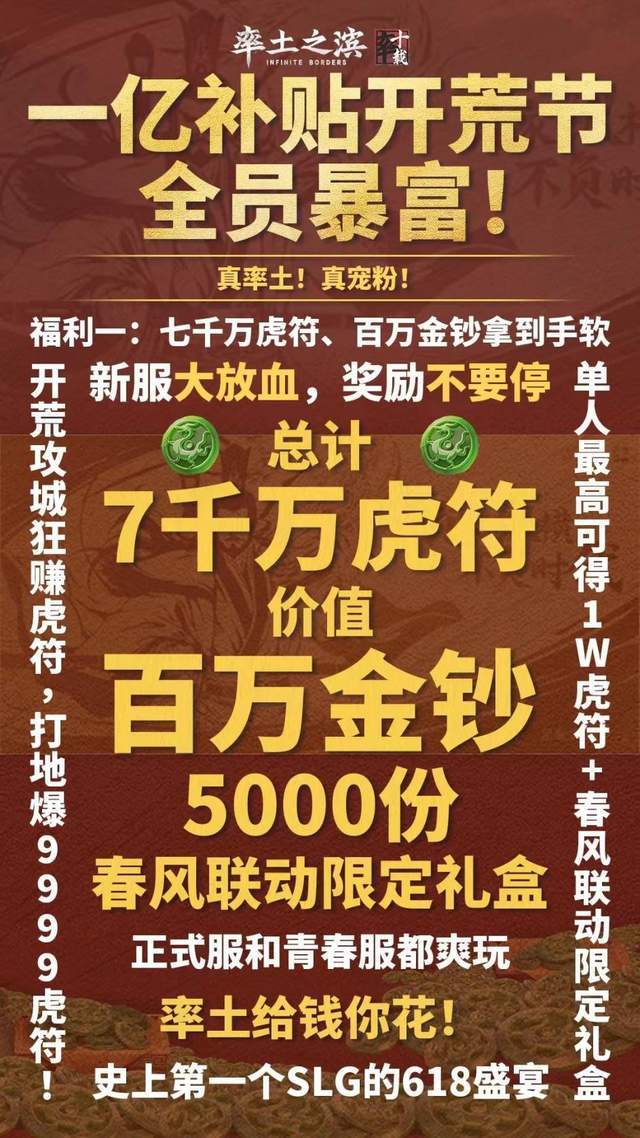 开荒节的福利设计堪称 SLG史上最豪横。6月5日至30日期间,开荒榜前50名玩家直接带走春风联名限定礼盒,攻城歼敌榜前三猛将喜提80虎符。最激动人心的是首占5级地块时可能触发的9999虎符天降红包——真可谓“打地即暴富”!赛季征服盟武勋前30的玩家,更能捧回价值549元的0.5g纪念金钞,让荣耀化为掌中真金。