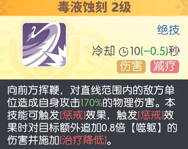 而在天赋达到2级后,其可以提供一个天赋暴击后能减少自身所有技能2秒cd的效果,天赋达到3级后则是提升攻击力与暴击,然后关键来了,天赋达到4级后可以在击杀对方时给自身和2位我方的角色施加“士气”,考虑到耶梦加得的斩杀线非常之高,所以这个效果能给我全队带来的增益也还不错,最后升到彩星后天赋的触发时间直接缩短1/3来到6秒间隔,虽然其意义虽然也不低,但耶梦加得触发“噬躯”的伤害也不仅仅只靠这几秒的间隔,例如她的大招和小技能也都可以触发“噬躯”伤害。