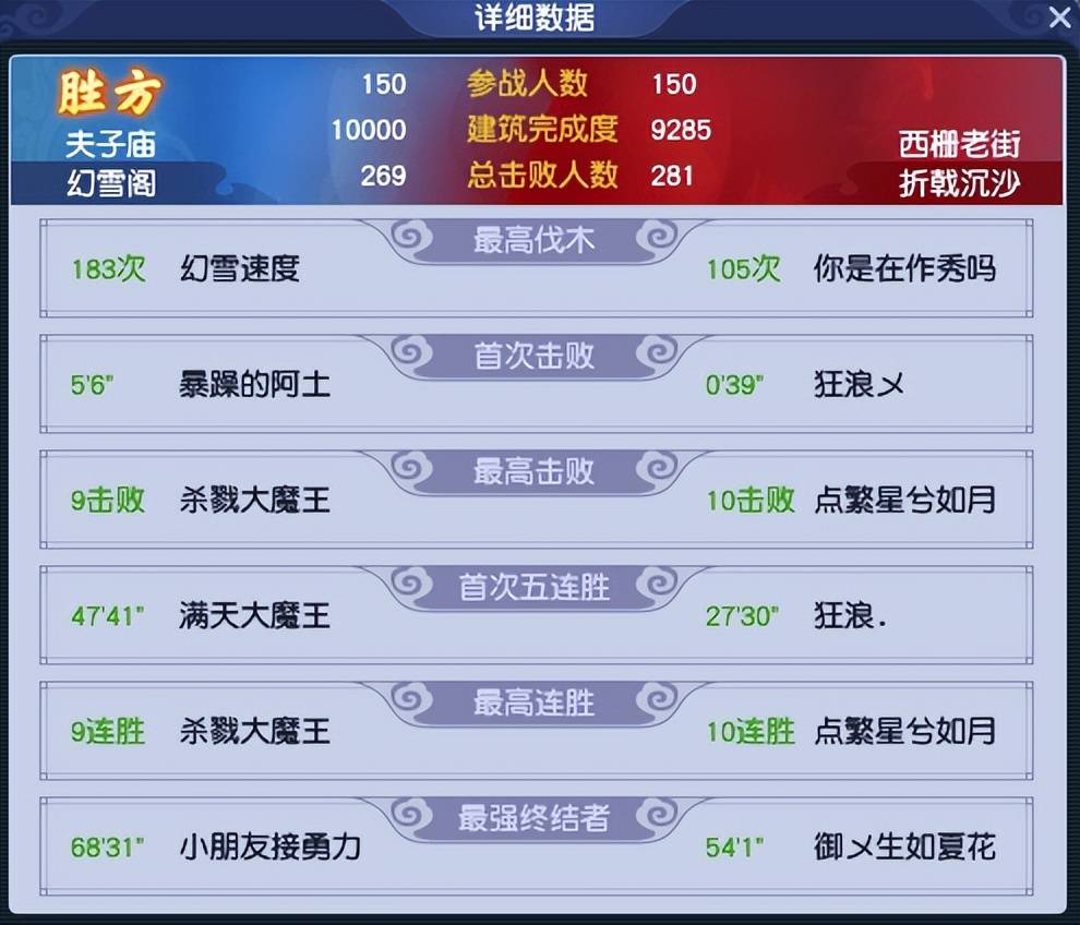 最终,【幻雪阁】以10000:9285的建设差距拿下比赛。从赛后数据来看,这场比赛的核心功臣非“幻雪速度”莫属,其在总耗时1个小时15分钟33秒的比赛中共伐木了183次,伐木速度达到了恐怖的24.7秒/次,这个数据在整个帮派联赛中都堪称顶级。这一局的胜利,算是奠定了【幻雪阁】夺冠的基础。