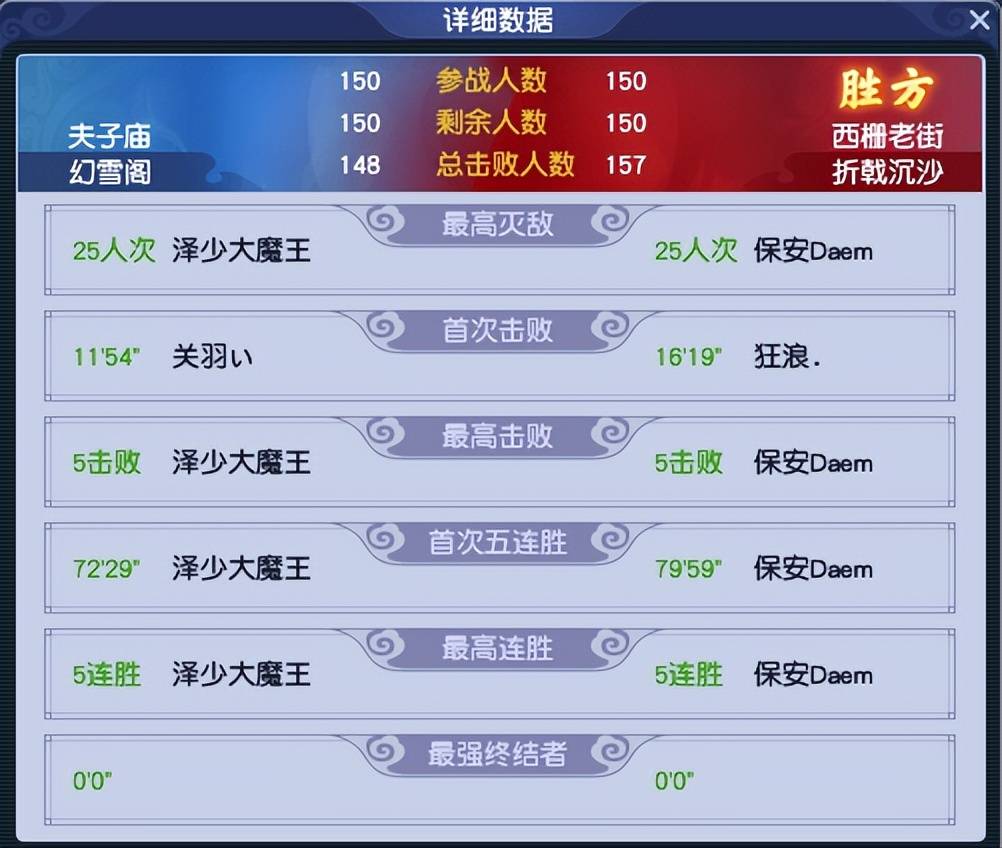 最终,【折戟沉沙】以157:148的总击败优势,翻牌【幻雪阁】,将比分追成1:1平。
