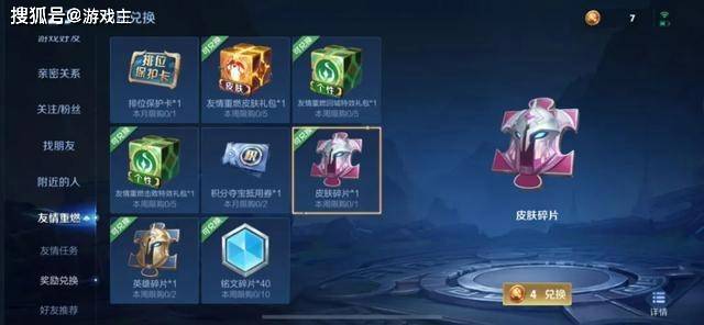 里面每周都能兑换1x皮肤碎片,每月兑换1x积分夺宝券,其中的友情币需要跟回归玩家组队才能获得,建议直接在大厅寻找做任务,并不复杂。