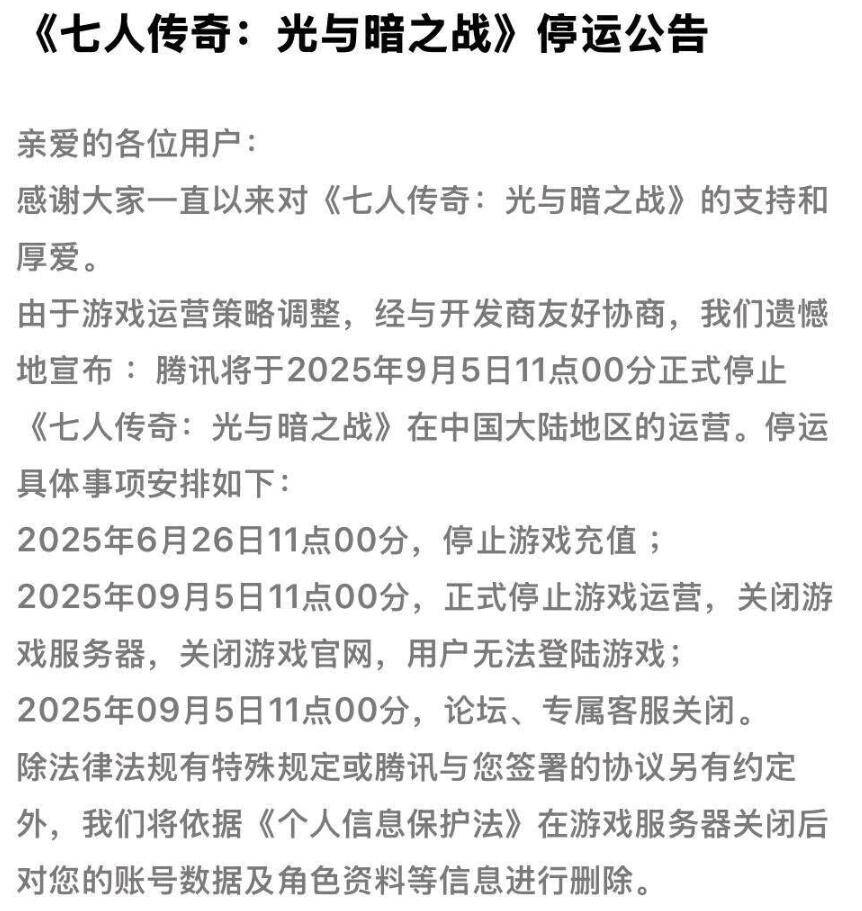 近日由剩饭工作室研发,腾讯代理的《七人传奇:光与暗之交战》(后文简称《七人传奇》)宣布,因为运营策略的调整,游戏将于9月5日停运。