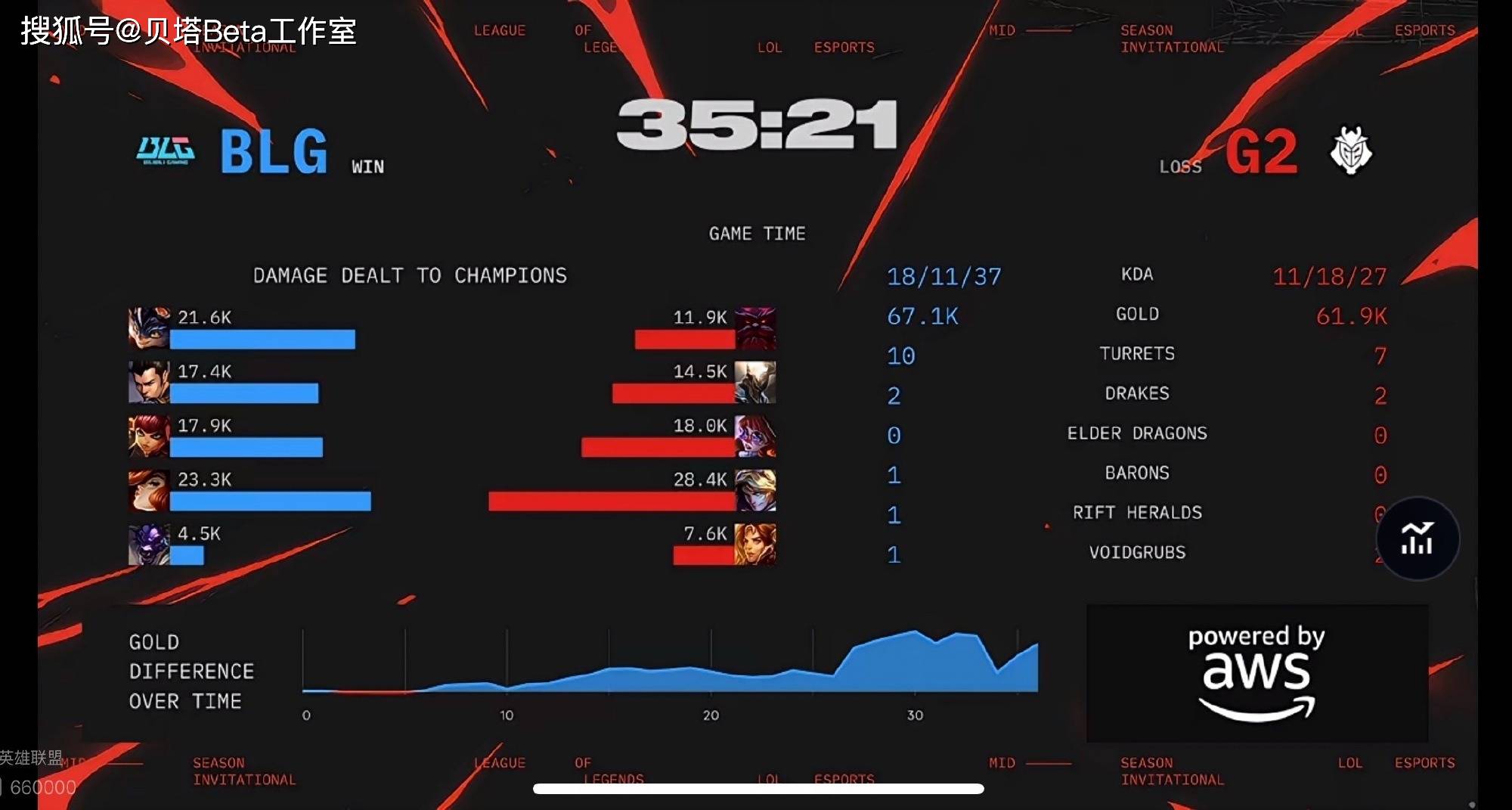 中期BLG拿下厄塔汗,27分钟双方中路混战,虽然Knight安妮被秒,但是ELK女枪完美大招,BLG打出1换3后,又在龙坑击杀Caps阿萝拉,随后BLG拿下第一条大龙。后期33分钟双方中路拉扯,G2这波完美poke,率先打残BLG众人,之后奥恩大招分割战场,G2打出1换4想要一波结束比赛,但是ON牛头疯狂拖时间,最终G2差一点推平BLG基地,BLG众人复活后反打团灭G2后,反一波拿下第一局的胜利。首局伤害最高的是hans sama的EZ。