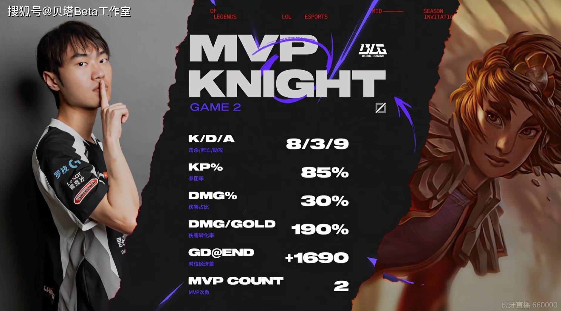 中期BLG三人抓下击杀BB贾克斯,随后拿下厄塔汗。23分钟G2先手开团,没能击杀ELK韦鲁斯,BLG反打打出0换2后,拿下水龙魂。26分钟G2打野蔚绕后被抓死,BLG拿下第一条大龙。最终30分钟BLG在高地击杀G2四人后,拿下第二局的胜利。MVP给到了Knight岩雀。