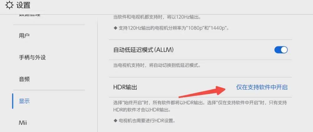 然后下拉页面找到第二个「HDR输出」选项,点击「仅在支持软件中开启」即可