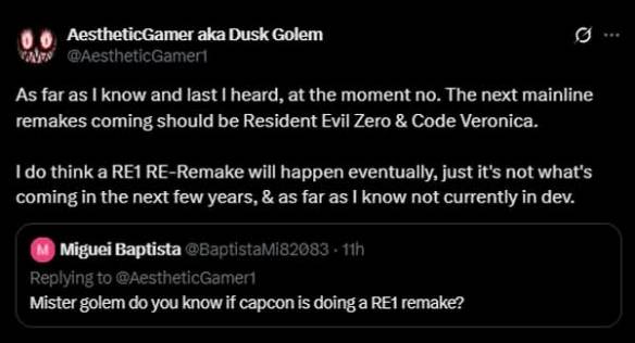 CAPCOM自《生化危机7》起重启系列,并陆续推出《生化危机2》、《3》及《4》重制版,令玩家对《生化危机1》重制也寄予厚望。不过最新消息指出,CAPCOM暂无计划重制初代作品,反而倾向于优先处理《圣女密码》与《生化危机0》。