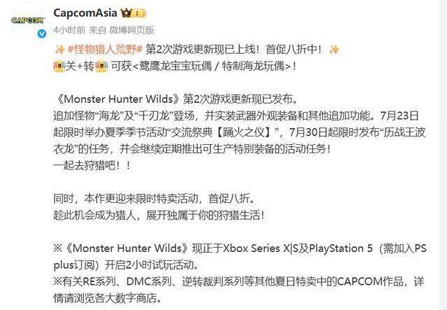 这次更新追加怪物“海龙”及“千刃龙”登场,并实装武器外观装备和其他追加功能。7月23日起限时举办夏季季节活动“交流祭典【踊火之仪】”,7月30日起限时发布“历战王波衣龙”的任务,并会继续定期推出可生产特别装备的活动任务!