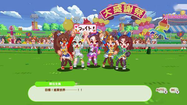 该作的画面风格为像素风,将有共计超过 20 名赛马娘登场,游戏中玩家将以个性鲜明的 4 支队伍对“热血喧闹大奖赛”发起挑战,挑战赛中分为“障碍赛”“篮球赛”“躲避球”“大胃王”4 项,需要从队伍中选出代表参赛,取得胜利。