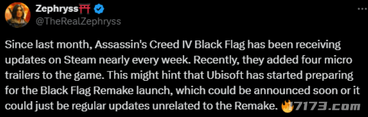 近日,有外网舅舅党爆料称,《刺客信条:黑旗》重制版即将正式亮相。这一猜测源于过去几个月中,《刺客信条:黑旗》原版在Steam平台上频繁更新,尤其是6月21日发布的包体内出现了4个全新的“微预告片”。这些迹象表明,育碧可能正为这款经典作品的重制版做最后的准备。