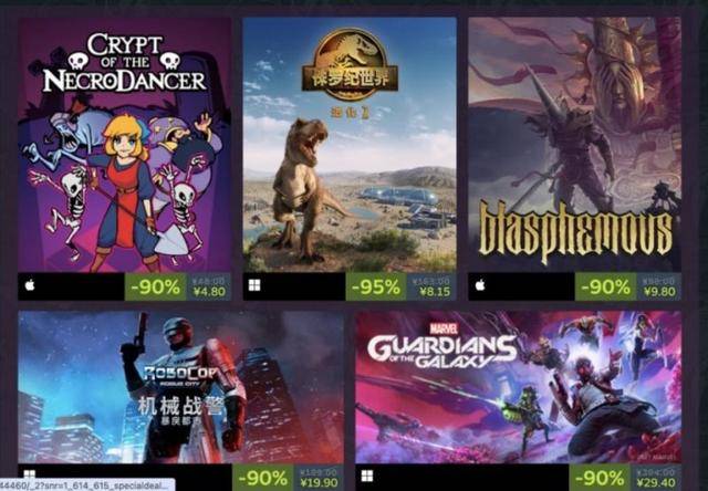 Steam还显示“精选深度折扣”专区,玩家可以直接在首页找到降价幅度最大的游戏。该板块精选了多款“佳作”,降价幅度从85%至95%,多款游戏价格“骨折”后仅为个位数,其中包括3A大作《侏罗纪世界:进化2》,从163元降价95%至目前的8.15元。