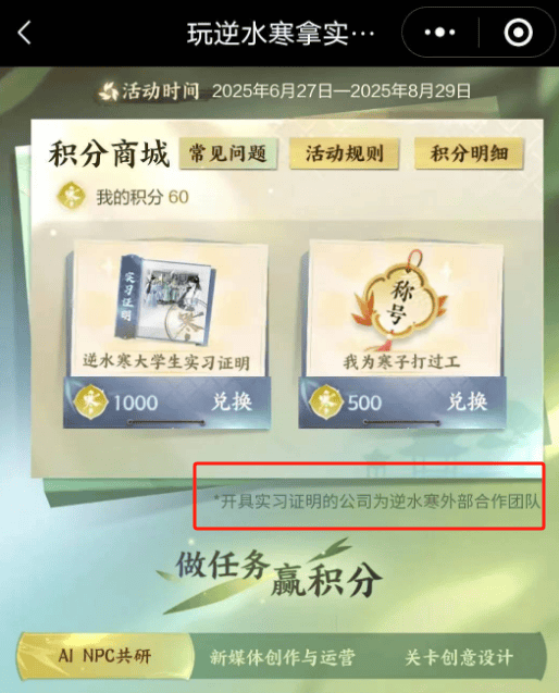 在活动介绍显示该活动从6月27日持续至8月29日。参与需满足特定条件:玩家需通过微信小程序进行身份认证(仅限国内高校在读大学生,通常需学信网认证)和实名认证。完成任务后可获得积分,1000分兑换实习证明(二选一),500分可兑换游戏内称号“我为寒子打过工”。活动也引发了诸多疑问:实习时长过短? 企业认可度?此类“游戏实习证明”能否被用人单位认可并写入简历,是最大的疑虑点。