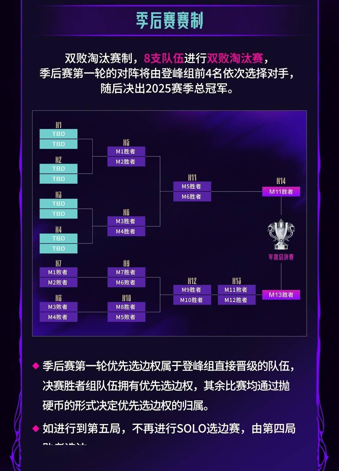 最终在 9 月 7 日开始的季后赛中,4 支登峰组直通队伍将和 4 支骑士之路晋级队伍一道展开双败淘汰赛的对决,首轮将由登峰组前 4 名依次选择对手并拥有优先选边权。本赛段季后赛决胜局取消 SOLO 选边赛,选边权归属第四局败者。