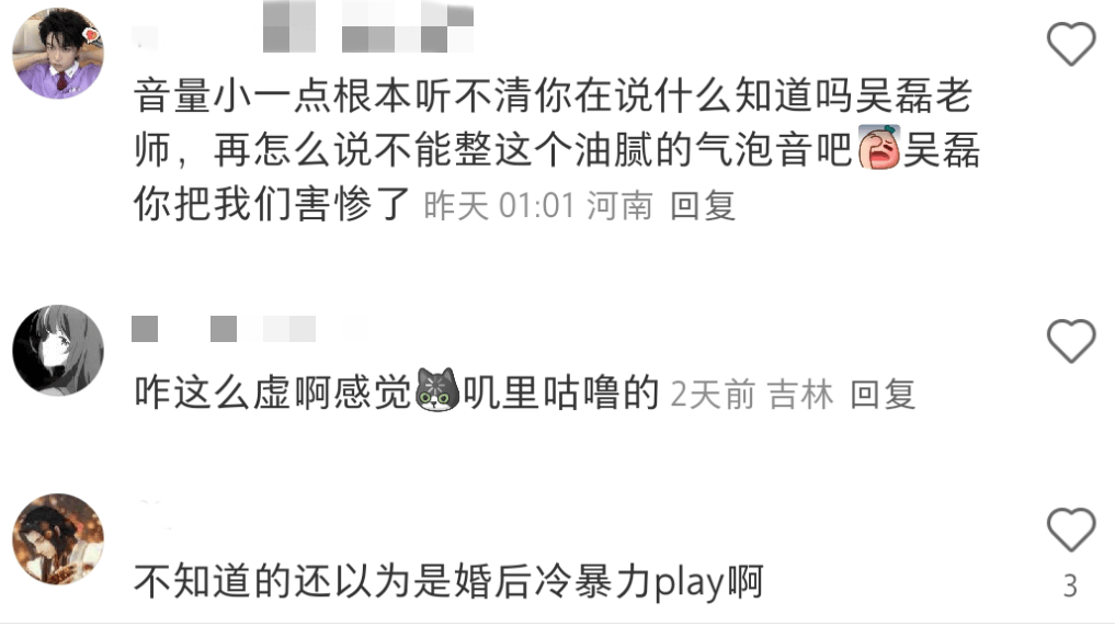 姬对配音并无专业认知,仍能听出来李泽言的声音确实变化较大,鼻音相比以前严重,有些地方还变成了“油腻气泡音”。而且不光硬件问题,疑似吴磊本人的口腔状态在录音时候没打开导致吐字不清,也没有以前自然了。前几天的夏活来电更是让很多李夫人惊掉下巴——这声音居然是李泽言?