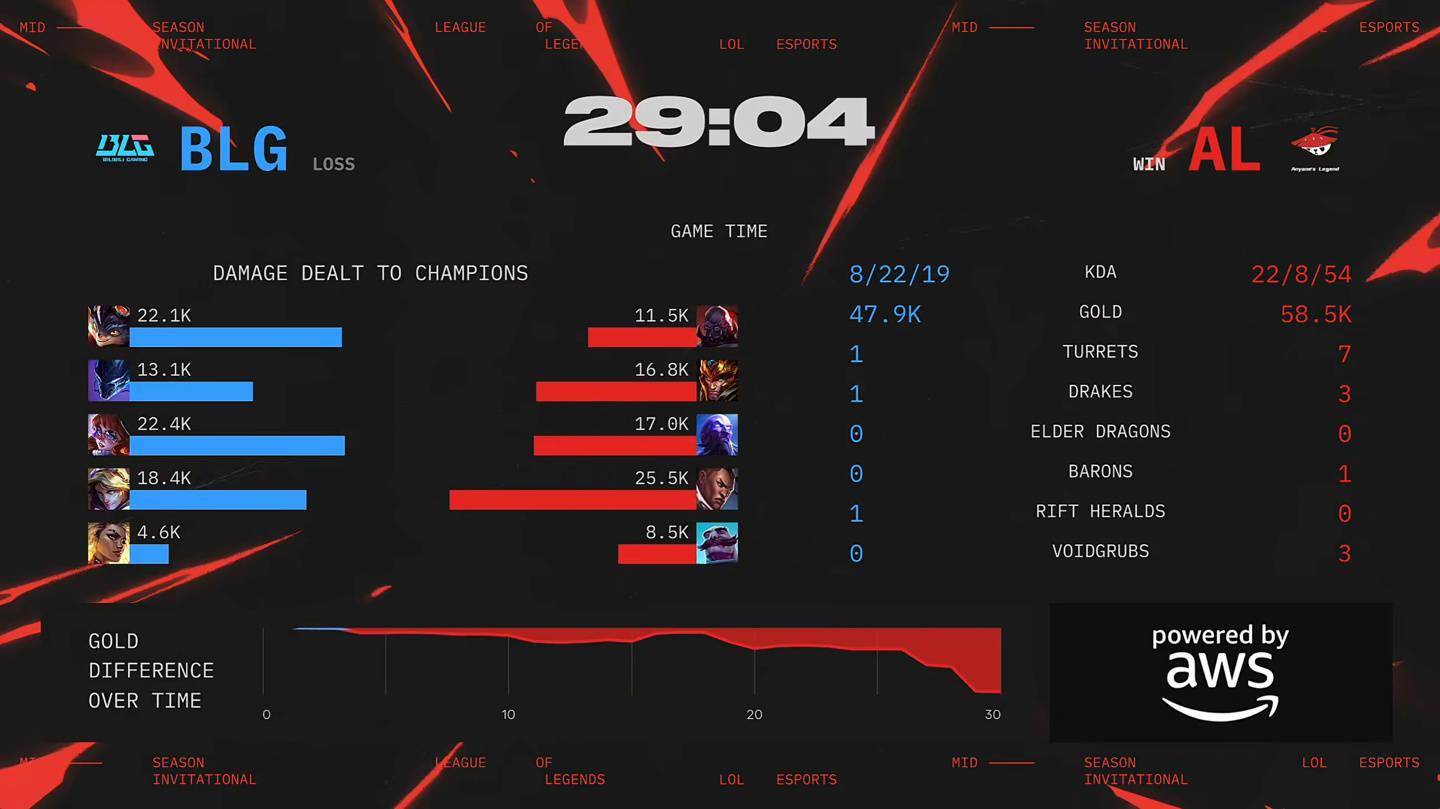- 28 分钟:AL 进攻 BLG 高地,Hope 卢锡安完成超神,AL 击败 BLG 四人并推平基地拿下胜利。
