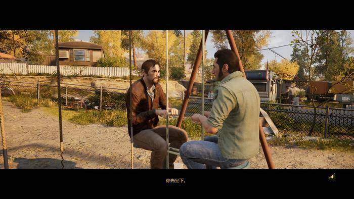 游戏里的一些细节互动、迷你游戏环节也非常有趣,虽然都很简单,但一定程度上辅助了对角色形象的刻画。比如越狱出去以后,即使时间紧迫、周围环境危机四伏,两个中年男人还是会被社区的儿童游乐设施吸引,做出无厘头的举动。