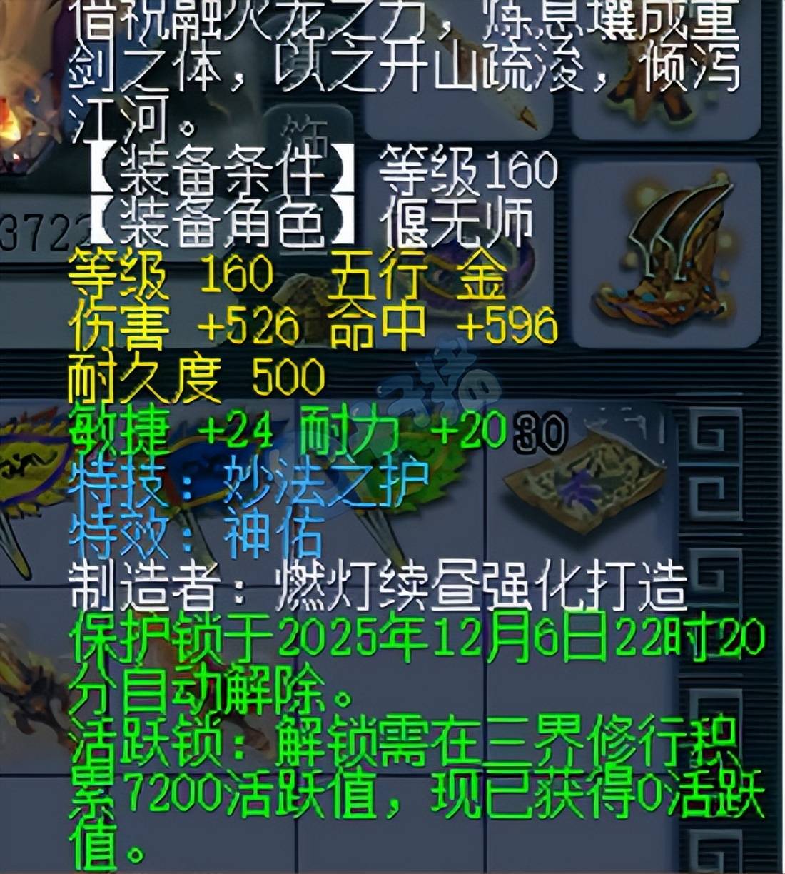 年末鉴定冲刺,果然容易出惊喜。一位老板在鉴定中炸出一把逆天160巨剑。它不仅具备伤害526、敏耐双加44的属性,还带“神佑+妙法”双特效。这个组合既有复活几率又有法防属性加成,直接一跃成为了顶尖服战神器!