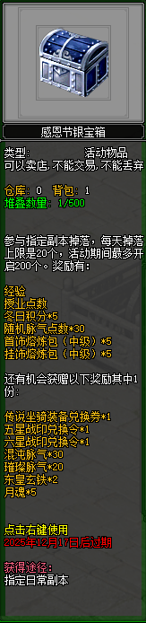大侠通关副本、幻境等玩法会额外掉落感恩节银宝箱/金宝箱,每种宝箱每日最多获得20个,开启可得对应好礼。
