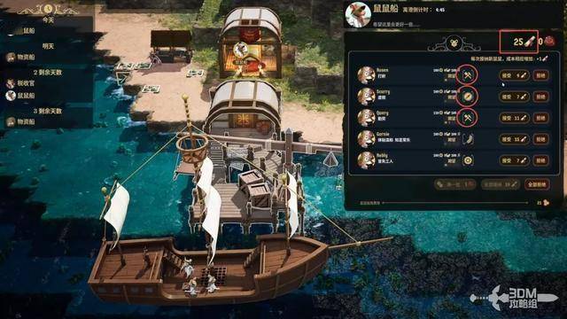 稍后会有物资船前来运送物资,每次接受物资都会欠下一笔债务,每隔几天都会有收债务的船只过来收债。玩家需要在这些天内采集岛上的资源用来交税。