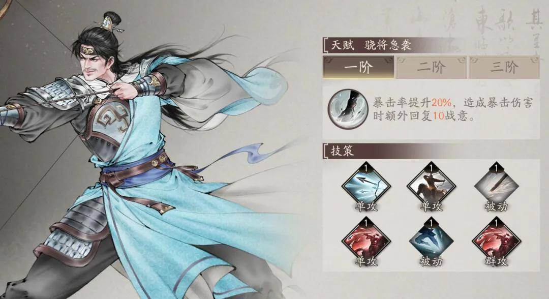 第二位夏侯渊,主打移动+暴击输出的弓手,同时也是会在开局后免费赠送且升为超品阶的武将,当然这里特别提一句......下个版本就会升阶的曹洪和陈到应该理论上和夏侯惇与夏侯渊类似,更多只是属性上的提升,但应该官方也不会把他们拿来污染后续的池子......