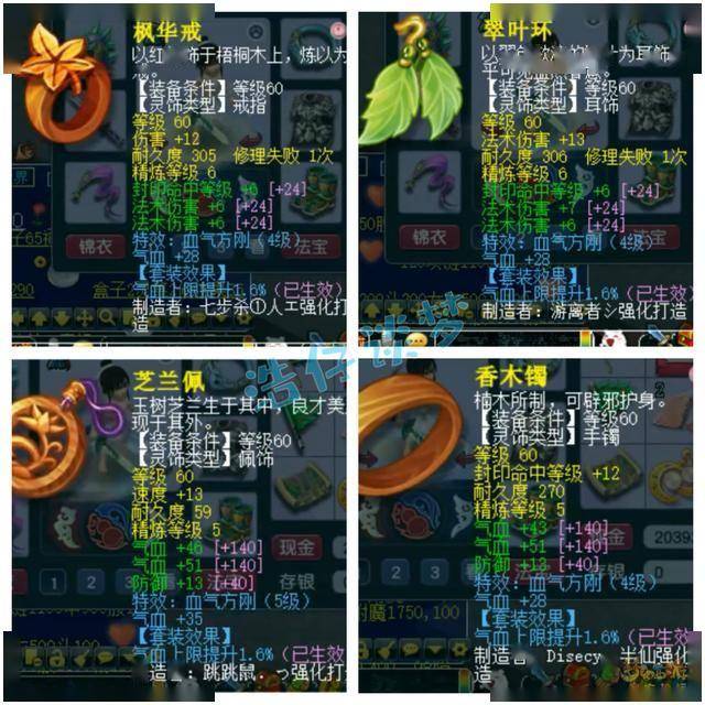 戒指和耳饰下排都是双法伤一封印,配饰和手镯下排都是双气血一防御,特效选择了血气方刚。