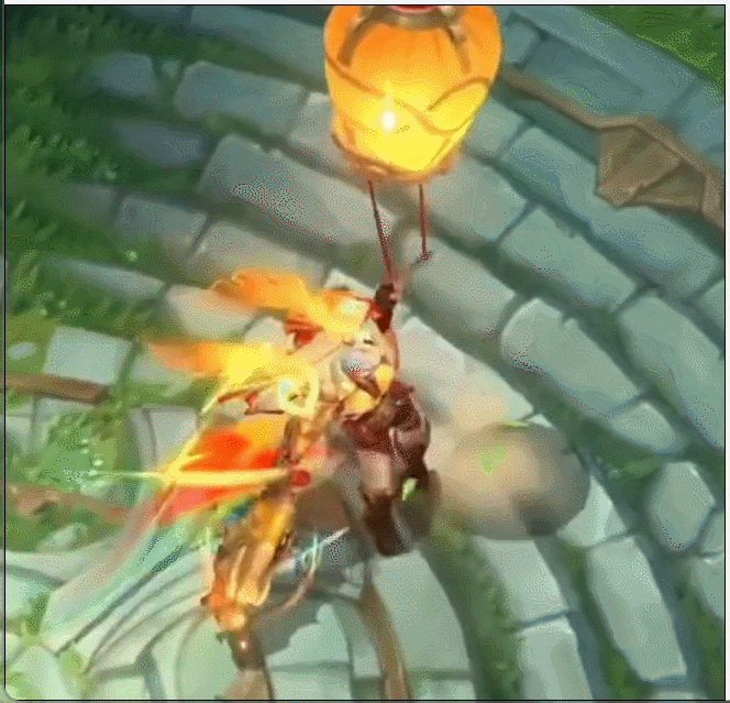 回城时,男枪会点燃一盏孔明灯,并抓着孔明灯起飞。