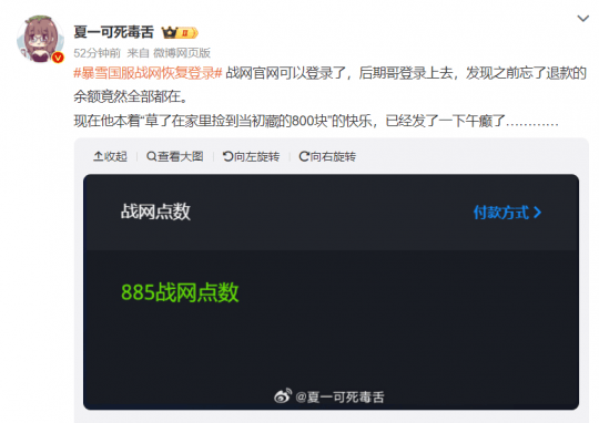 夏一可就分享了做后期的同事,重新登录账号后还发现了当初没有退款的账号里剩余的战网点数。对于普通玩家来说,这或许也算是暴雪、网易“复婚”后,所提供的好处吧。至少在旧有数据的交接与恢复上,玩家们无需太过担心。