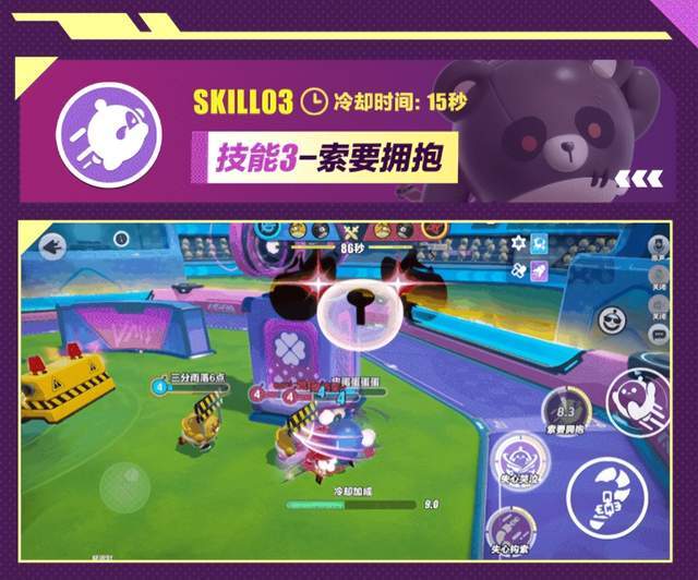 仔仔熊一技能——惊喜礼物,随机扔出红、绿、蓝、金四种礼物,分别可以让己方增加攻击、回复血量、增加移速、提升所有能力,是非常好用的辅助技能哦!二技能——欢乐派对,仔仔熊会向指定方向挥舞拐杖并造成伤害。最厉害的是它的三技能——爱的抱抱,仔仔熊会把队友装进礼盒,在礼盒中的队友不仅免疫伤害还能恢复血量,从礼盒中扔出后还可以大幅度提升队友的攻击与防御,且这个技能还可以对自己使用!这么强大的辅助技能,小蛋仔们有没有心动呢?