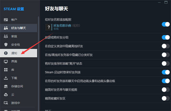 4、在左侧steam设置菜单栏选择【通知】,进入通知界面。