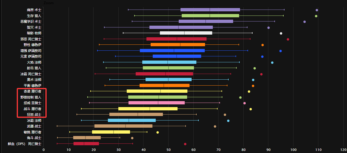 万万没想到,在WLK大放异彩的近战三兄弟(盗贼、战士、惩戒骑)竟在时光服里沦为下水道,想要在输出第一页找到这三种颜色可太难了。尤其是盗贼,如今都变成稀缺职业,第一周的团长组不到盗贼再正常不过,因为他们把天赋带到PVP。
