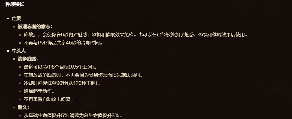 蓝贴里除了这两个职业改动以外,还对部落亡灵和牛头人种族进行了调整。亡灵意志获得史诗级加强,6秒对魅惑、恐惧和催眠效果免疫,而且不再与PVP饰品共享45秒CD,亡灵以后的定位就是为PVP而生。