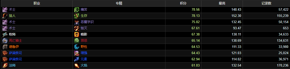 从MC首周的数据来看,DPS前五名分别是:痛苦术、生存猎、恶魔术、毁灭术和暗牧。单是术士就占3个坑,原来大家口中的百花齐放是指术士三个天赋,这么一说就懂了。但话又说回来,术士3系加起来却没有生存猎的多,所以第一周的霸主还得是猎人。