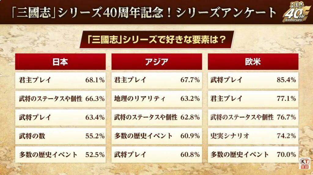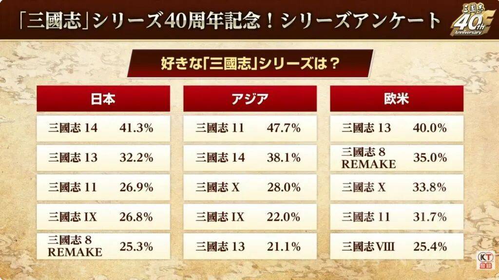 就在12月10日,光荣刚开了一个40周年纪念直播。除去对《三国志》系列的絮絮叨叨、嘉宾喜欢哪作《三国志》等等直播常见环节之外,光荣还公布了之前发布的调查问卷的结果。