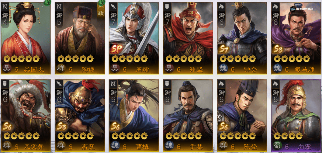 这个卡包的核心武将为SP周瑜、钟会、兀突骨和曹植,普通卡里面有陶谦、孙坚、司马师、于禁、陈登、吴国太几张比较好用的卡。