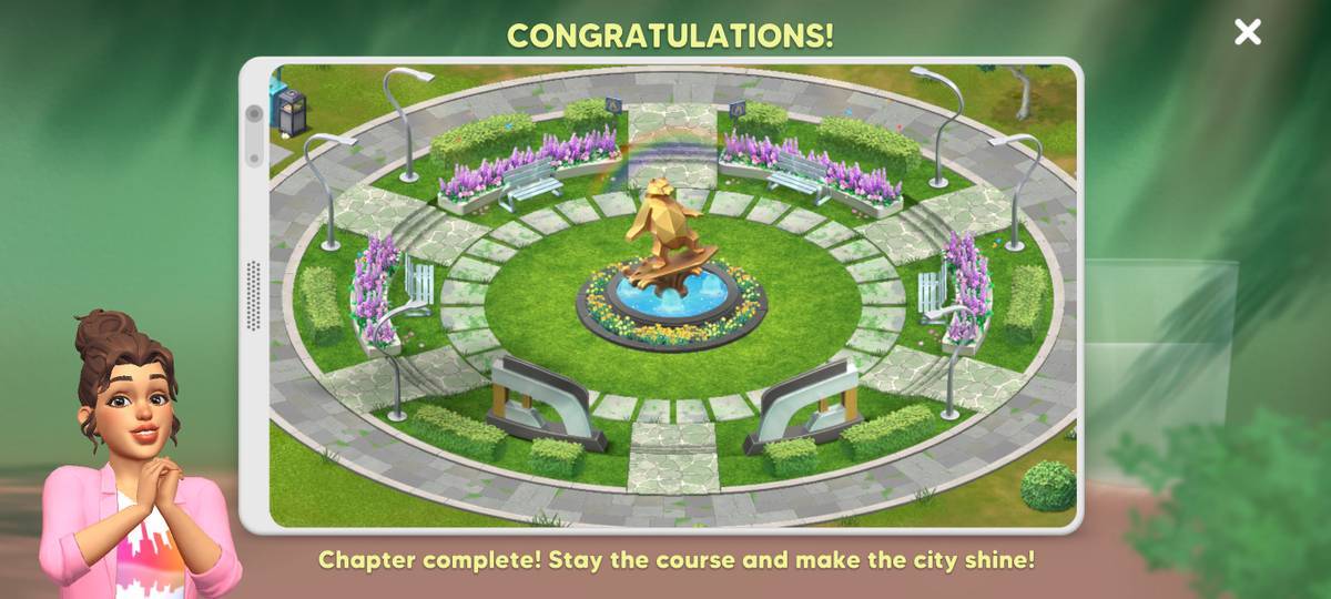 当然,【Modern Community】不只是将“短剧”剧情融入游戏,还把之前流行的一些装修玩法也融了进去,玩家可以根据自己的审美去选择喜欢的装饰(也是简化之后的三选一模式)。在完成所有的装修后本章节就会结束,玩家随即就可以获得章节通关奖励(第一章是1K金币)和一张美丽的通关图。