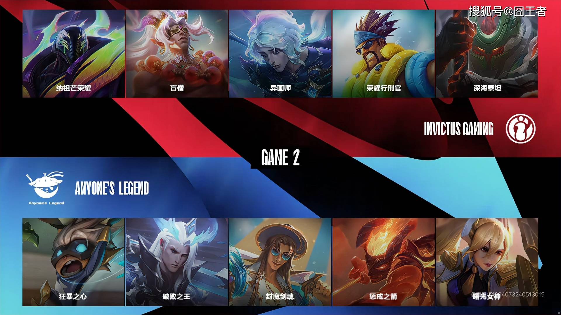 第二局比赛,AL蓝色方,禁用飞机,蝎子,兰博,狐狸,龙王,选用凯南,佛耶戈,永恩,韦鲁斯,蕾欧娜;IG红色方,禁用妖姬,小炮,豹女,卡牌,青钢影,选用奎桑提,盲僧,慧,德莱文,泰坦