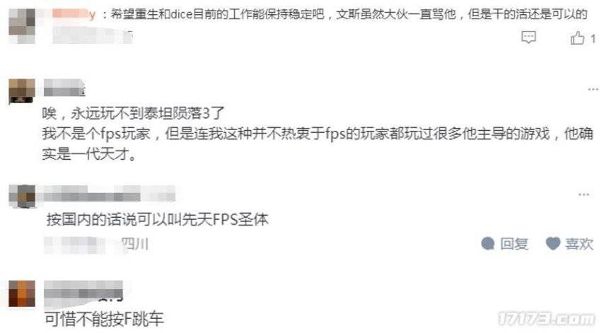 对于文斯的去世,有网友表示,希望工作室能保持稳定,虽然大家经常吐槽文斯,但他干活还是可以的。还有网友感慨,他的确是个天才,我们永远玩不到《泰坦陨落3》了。对于文斯打造FPS游戏的能力,有网友大赞说,他就是先天FPS圣体。