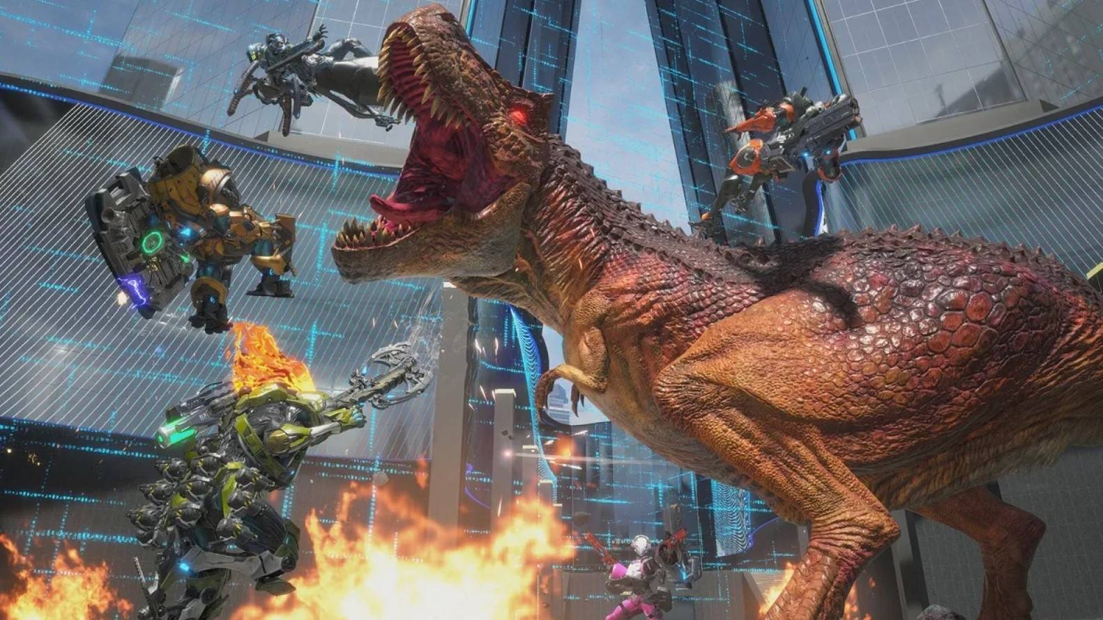 这些模拟战争组成了《原始袭变》中的 PvEvP 多人玩法。你们和另一只队伍要比比谁更快完成一系列有趣,不过刚开始较为单一的目标,包括简单地干掉 X 只恐龙、控制目标点,还有干掉一只试图逃走的血量更厚的恐龙,你们必须在成群的迅猛龙中杀出一条血路才能干掉它。率先完成所有目标的队伍能提前开始最终局,这一局比赛要么是更多 PvE 任务,要么是把两个维度融合到一起,让两支队伍直接竞争,在一个照搬《守望先锋》的模式中推动运载目标。