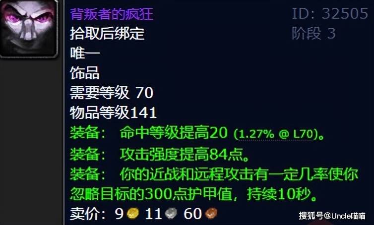 黑暗神殿伊利达雷议会的背叛者疯狂,个人觉得是一款容易被低估的极品破甲饰品,怀旧服时期喵叔甚至见过5000金币无人问津,最后被人2000金币捡漏走的,其实他的话对于狂暴战、野德配装的容错率是极高的,而且绿字攻击强度也不低,就是不明白后期为啥都不待见他!