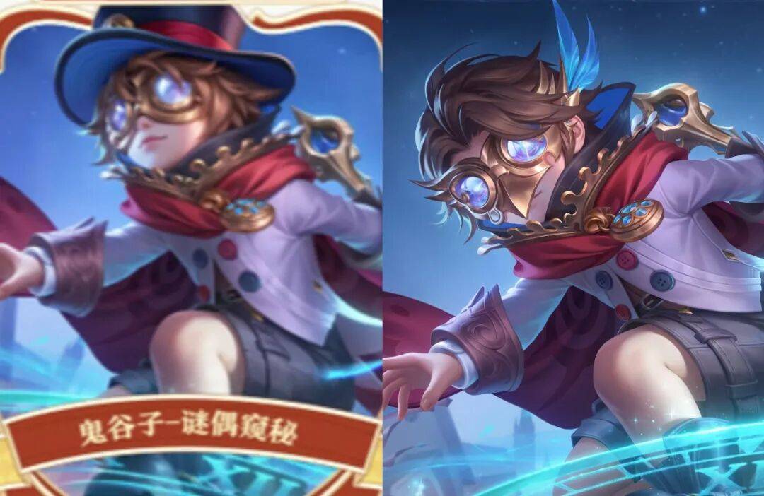 今天,看到了鬼谷子新皮肤谜偶窥秘的两个版本。左边这个是旧版本的,还有代表鬼谷子锚点的帽子。这个版本可能是画师原版。而右侧这个是新版本,是正式上线的版本。可以看到,帽子取消了,锚点上有所突破,而且眼镜也增加了鸟嘴的展示,可能是为了致敬鸟嘴医生。