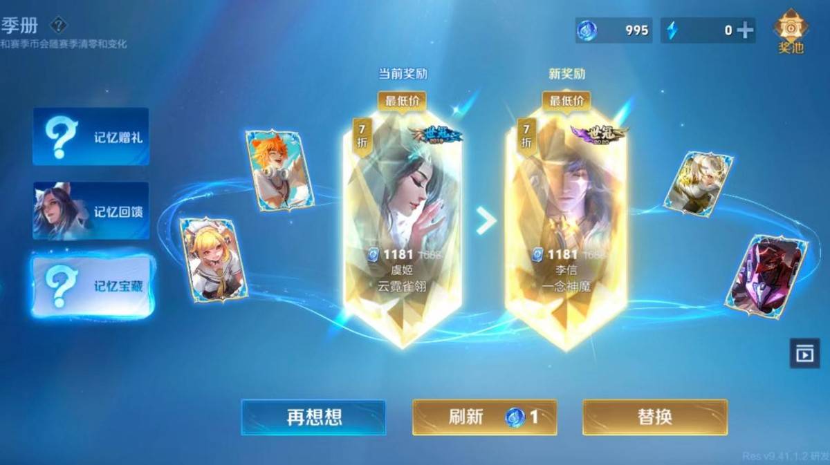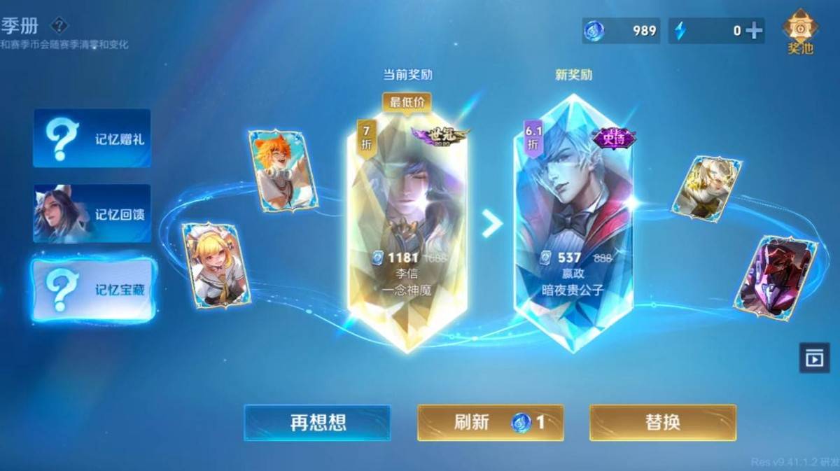 晓弟目前的账号里,回忆系统已经有着1000多赛季币,所以也是没有顾及的去刷新奖励,最终通过100多赛季币的代价,得知史诗皮肤和传说皮肤的最低价信息。