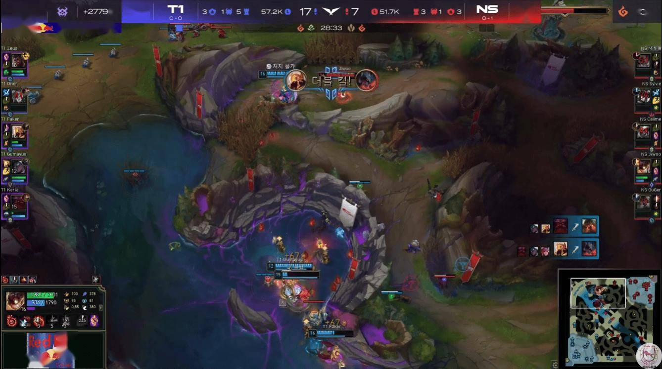 NS两局比赛在对线期结束之后,基本上都把目标锁定在了Faker身上。有时候甚至魔怔到全队交出所有闪现去杀Faker,这个意图是很明确的,或许也是大多数新人队伍想到最简单破解T1的方式,然而实行起来他们并不是GenG,终究打团能力差距太大了。
