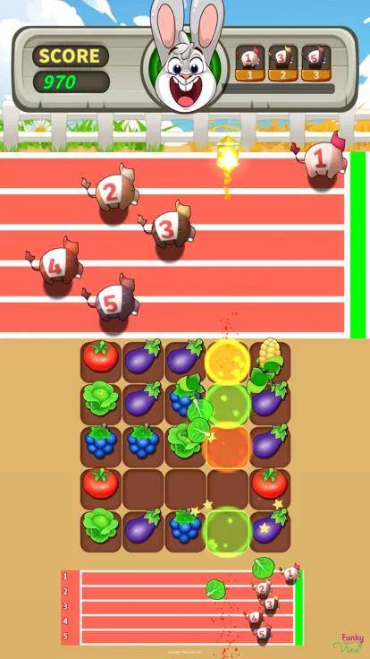 同样将三消融入到大富翁玩法中的手游,还有一款《Farm Raid : Mission》,以一只表情丰富的兔子为主角,投掷骰子在农场里行动。这款游戏中的大富翁地图比较大,不同的事件玩法也比较多,除了常规的三消收集农场作物的任务,还有三消为小猪赛跑助力等不同事件的玩法,将三消玩法深度融合进了游戏内容中。