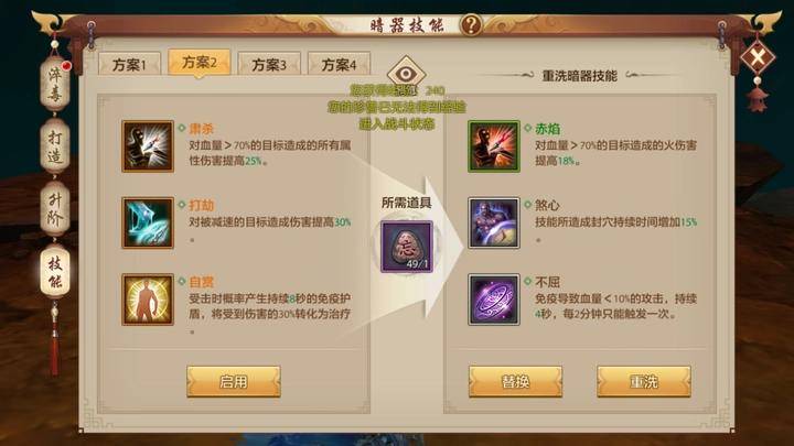 暗器技能:大规模战斗选择自赏,同门派对战选择不屈下图两种方案都可以为最优搭配