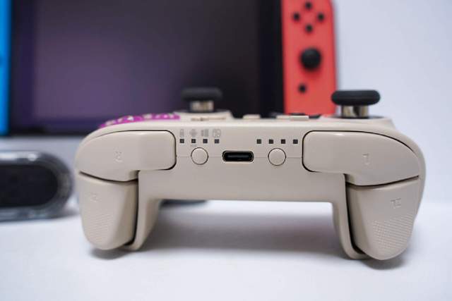 在手柄的顶部,设置了三大平台安卓、PC、Switch四个模式的指示灯,方便玩家随时了解当前所处的游戏模式。同时,还配备了模式切换按键、TYPE-C接口、手柄电量指示灯以及配对按键,让玩家能够轻松实现手柄与不同设备的连接和切换。