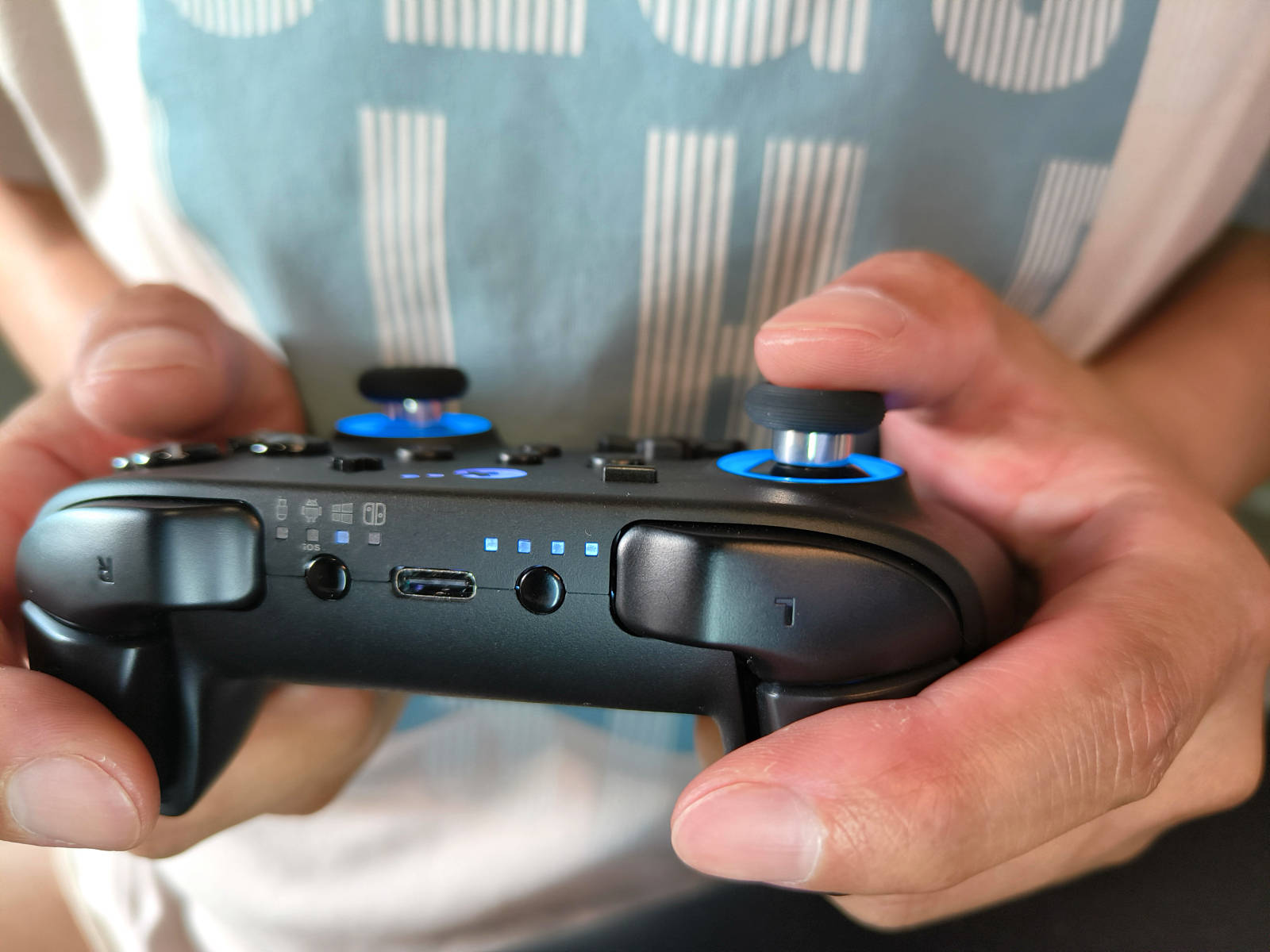 手柄顶部还配备有USB-C充电口及切换平台的四模式独立按键,支持有线、无线以及蓝牙连接。谷粒金刚3Pro还可以在PC、Switch、安卓、iOS、macOS以及Switch等多个平台上自由使用,无需任何插件,即插即用。