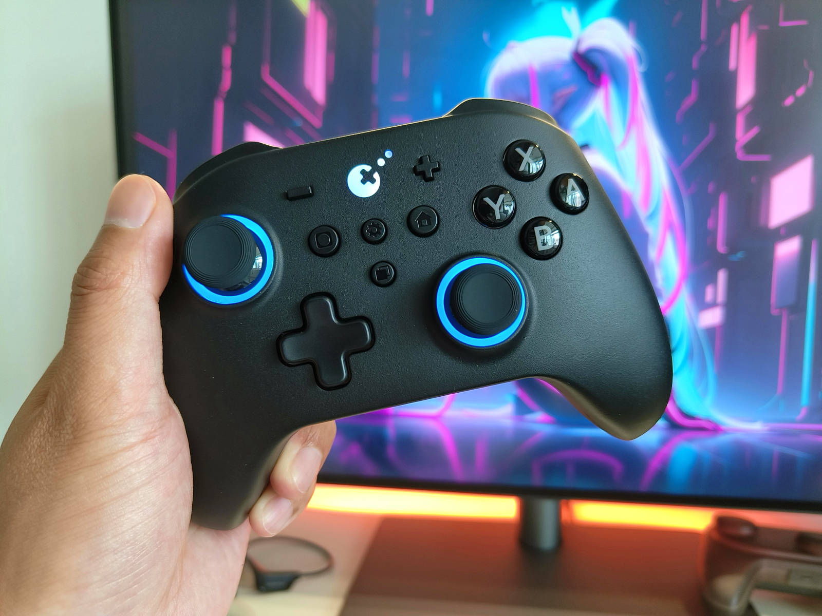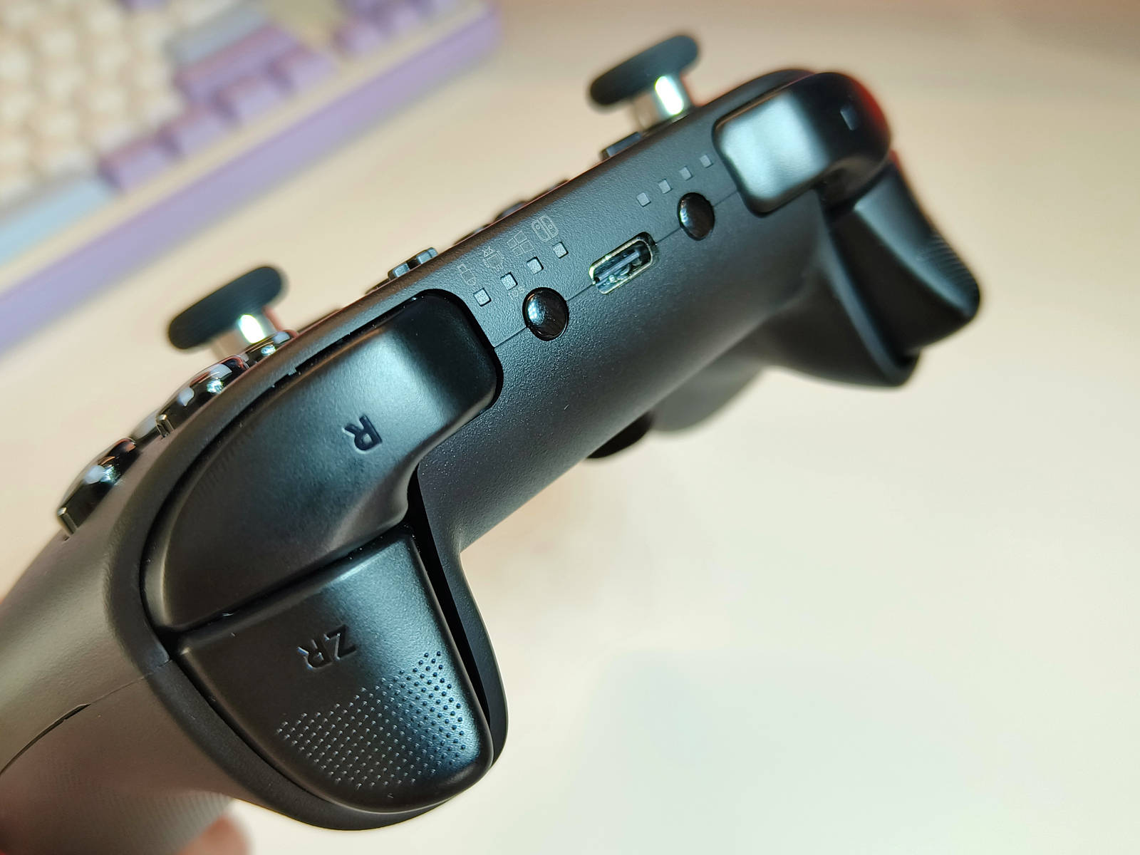 手柄顶部左侧按键可以实现开关机,以及模式切换,长按右侧按键可开启配对模式,另外通过右侧按键上方的指示灯可以实时了解手柄信号强度。手柄内部搭载了谷粒自研的磁悬浮马达,振动器的振幅强劲有力。