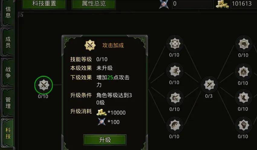 75级开放军团玩法,军团中开放专属的技能树,升级提高自身属性。升级所需荣誉点在军团战争中可以获得。