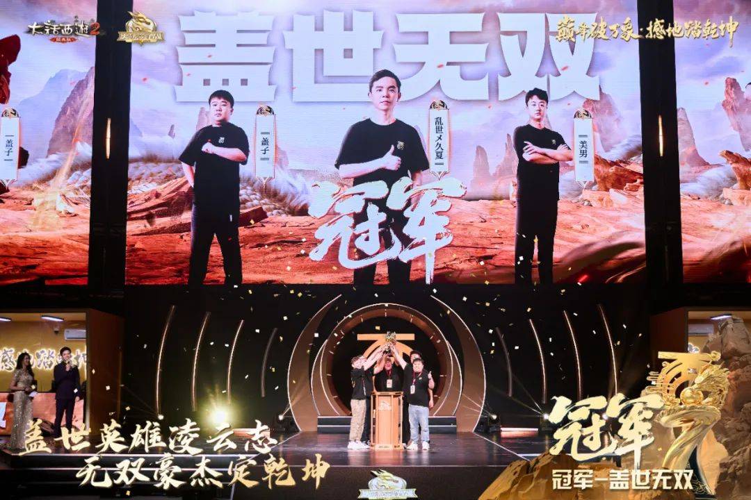 在全场观众的加油助威中,在震撼人心的鼓点声里,万众期待的巅峰之战正式开打!在五局三胜的比赛中,“盖世无双”首场以灵宝消耗数量获胜,第二场和第三场均以召唤兽消耗数量夺得胜利,最终也以3:1的比分逆风登顶,斩获冠军殊荣!