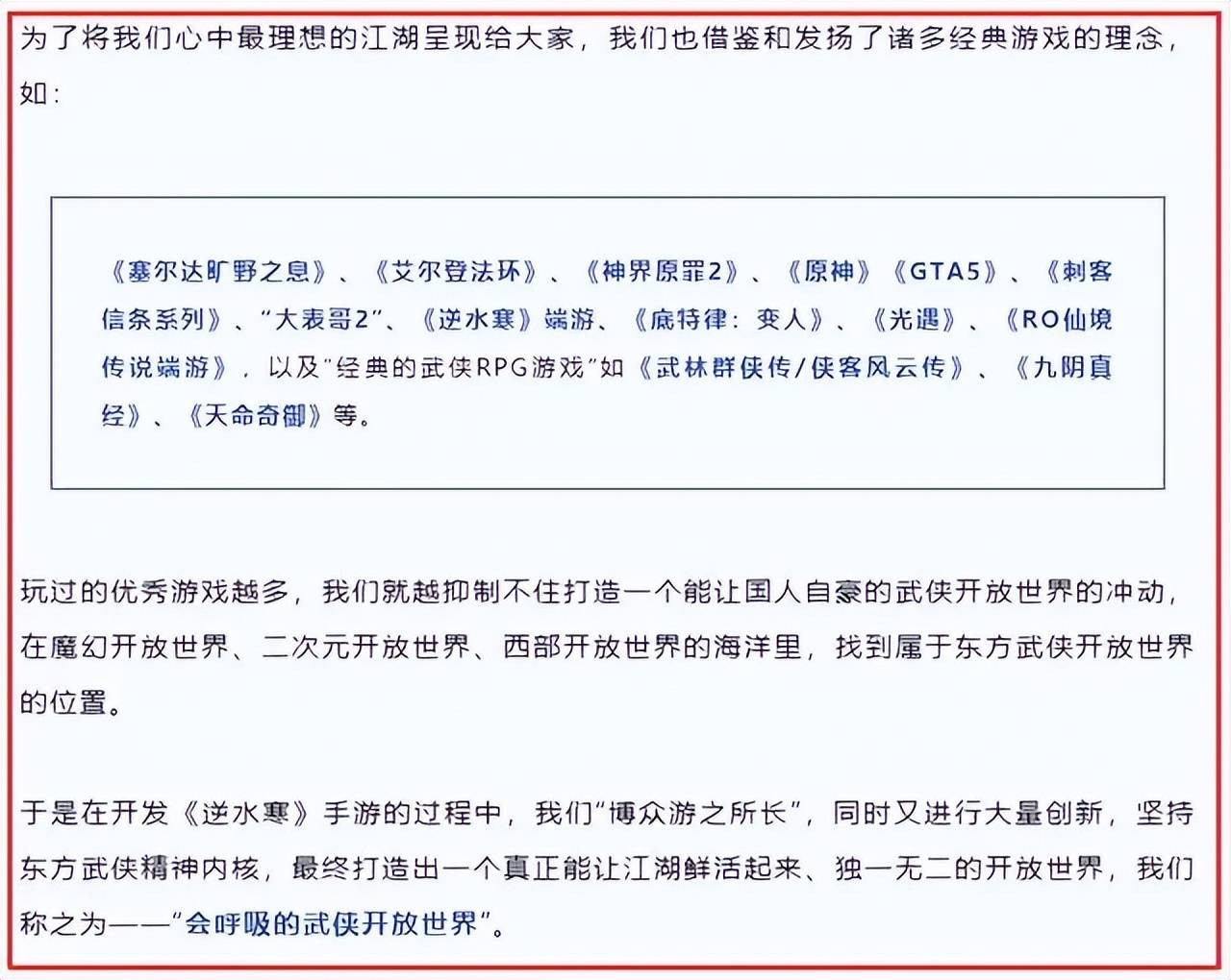 而说起MMO界最强的“缝合之王”,当属国民级爆款《逆水寒》手游。这款游戏还未公测的时候,官方就多次公开表示“借鉴”和“发扬”了大量游戏的理念,还列举了一大堆自己学习过的游戏名单,一连串的3A大作,把玩家们看的一愣一愣的。